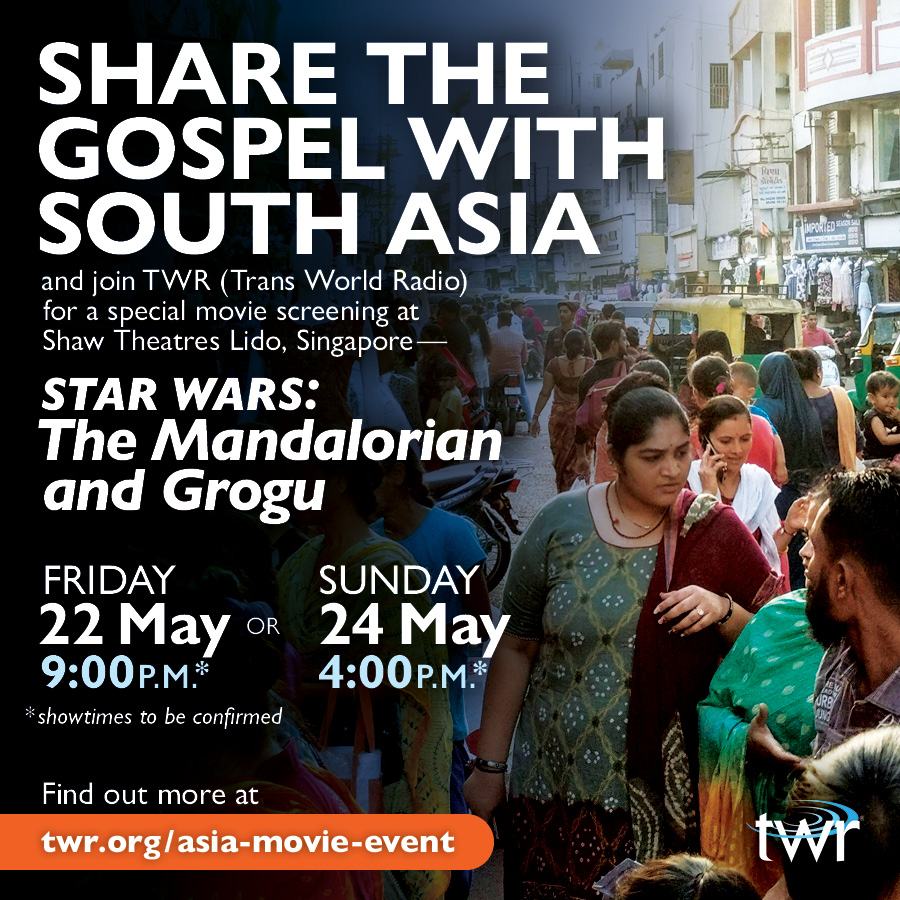 In support of TWR's media ministry to South Asia, we are organising two special screenings of Star Wars: The Mandalorian and Grogu at Shaw Theatres Lido, Singapore. For every gift of S$100, we would like to offer you a complimentary movie ticket to either screening at the following times.
