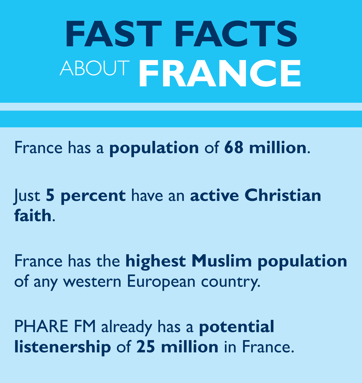 Chong said:More than 95 percent of people in France have no faith, and many have no idea about Jesus or the Bible. These are the people we are reaching with our broadcasts. It’s like missionaries a hundred years ago going into far-off countries and bringing the gospel for the first time. For example, I was told of a pastor who when he addressed a Bible study and said they were going to be studying the letter of Paul he heard one new believer ask another, ‘’Dd you get a letter from Paul?’ We give thanks that God is using PHARE FM to shine his light into the darkness in France. We can sense the quiet revival that is coming, and we want to play our part in this.”