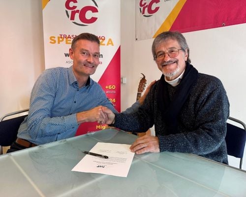 Images: (top, banner) Members of the CRC team and TWR staff gathered together, (middle, right) Left to right: Dirk Mueller (TWR Europe’s International Director) and Gianfranco Piccirillo (Chairman of the board of directors for CRC)