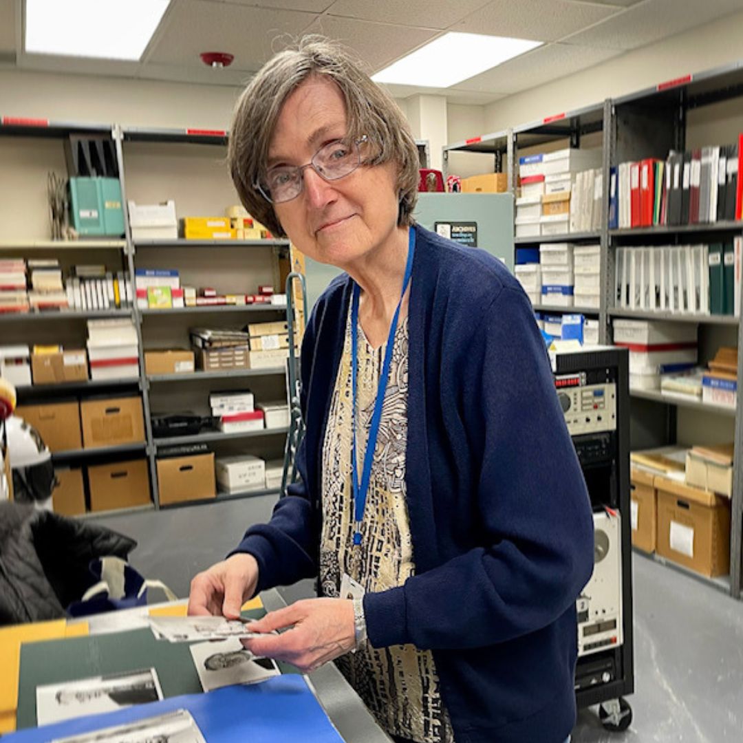 Images: (top, right) One of Tom and Elly Streeter's first prayer cards from their days in Monaco, (middle, left) Tom and Elly in Cary, North Carolina, (bottom, right) Elly Streeter, TWR's resident archivist, looks through old photographs in the archives at the U.S. offices where she and Tom now serve.